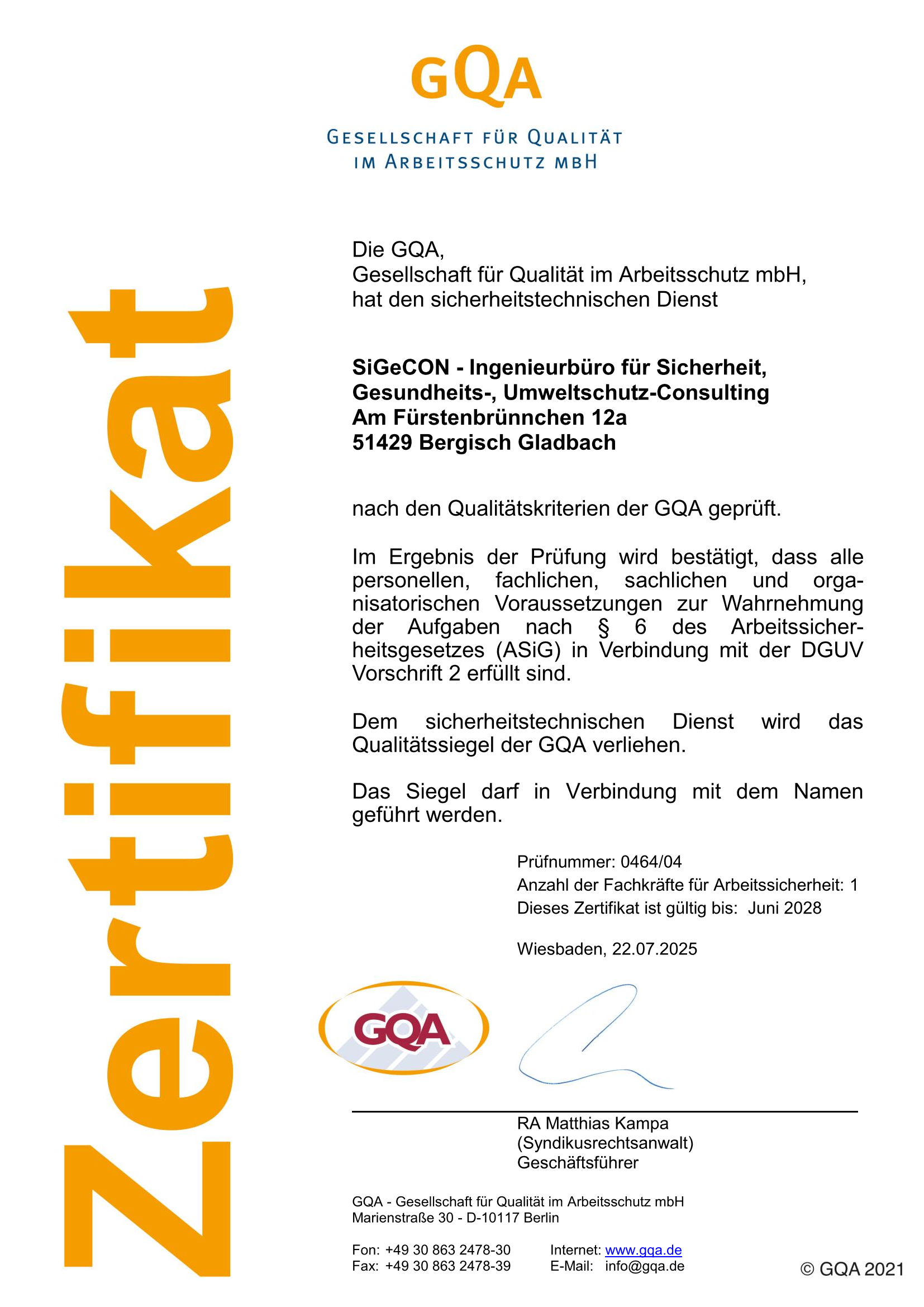 Das SiGeCON Ingenieurbüro ist seit 2004 regelmäßig wiederkehrend durch die GQA, die Gesellschaft für Qualität im Arbeitsschutz, zertifiziert und arbeitet nach den entsprechenden Qualitätskriterien. Das bedeutet für unsere Kunden ein hohes Beratungsniveau, permanente interne Weiterbildung sowie starke fachliche Kompetenz und sichert gleichbleibende Qualitätsstandards in der Betreuung.
